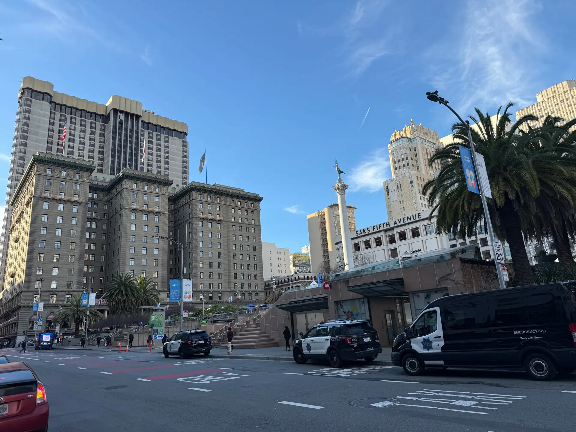 JP Morgan Healthcare Conference with security police vehicles outside the conference center